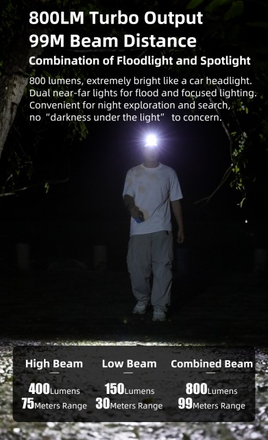 Opptil 800 lumen og opptil 82 meter rekkevidde.